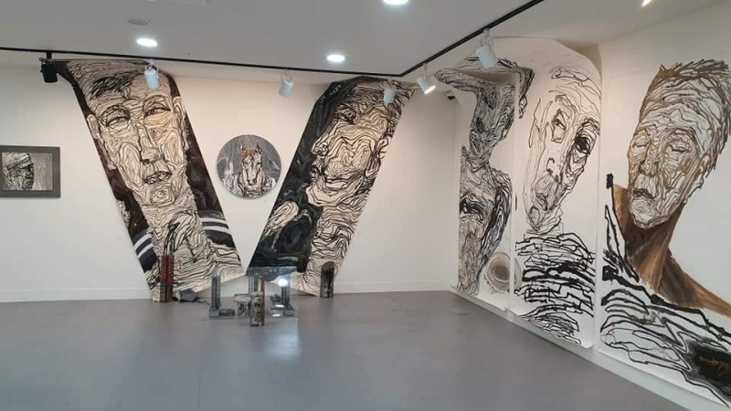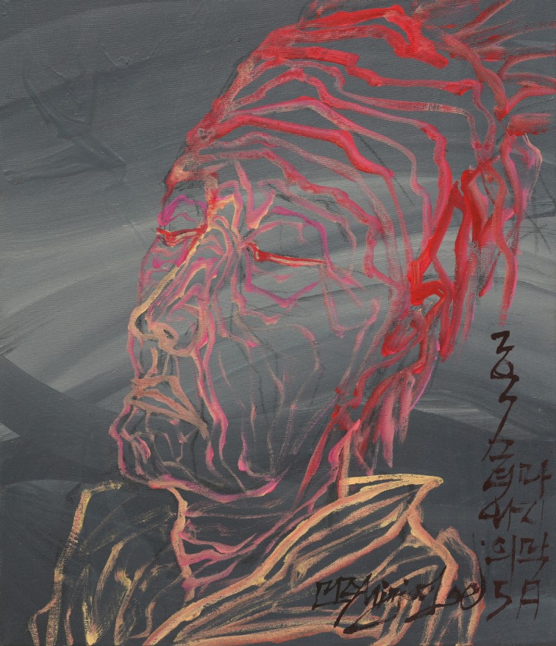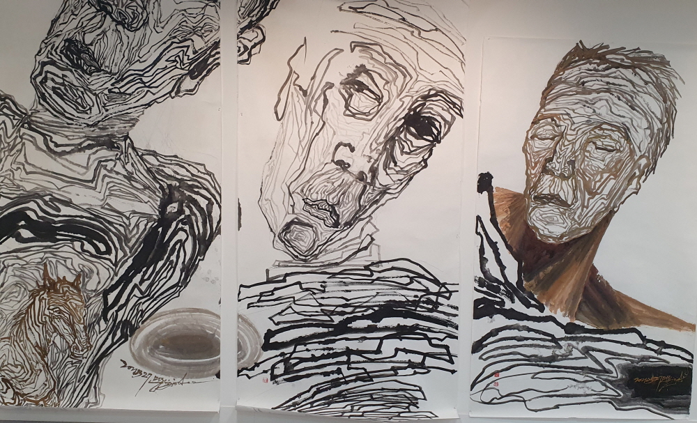 이번 전시의 주제재인 모상(母像)존재의 삶의 궤적인 농담의 수묵용필 선()의 주름 으로, 그 속에 인생의 고통 등 많은 의미를 표현하고, 삶의 궤적을 수묵농담의 중층 주름 선()으로, 동양화의 최고목표인 기운생동(氣韻生動)’, 즉 존재의 살아있음, 영령함의 근거인 기()가 리드미컬하게 생동하듯, 빠르게 운율적으로 움직임으로써, 죽음이라는 숨막히게 무거운 주제에 다가가면서도 우리를 숨쉬게 한다. 이것은 수묵용필이 흑백이면서도 동시에 쾌속(快速)의 선염을 동반한 필묵 선으로 여백을 포괄해 정신성과 물성을 표현하는 전통 수묵의 정신적인 우수한 점 때문에 가능한 것이다. 그러나 지금은, 말과 얼굴은 죽음이라는 절대절명의 문제 앞에서 여백을 사용할 여지가 없다.