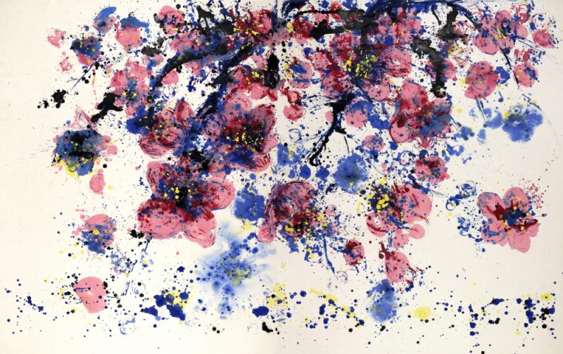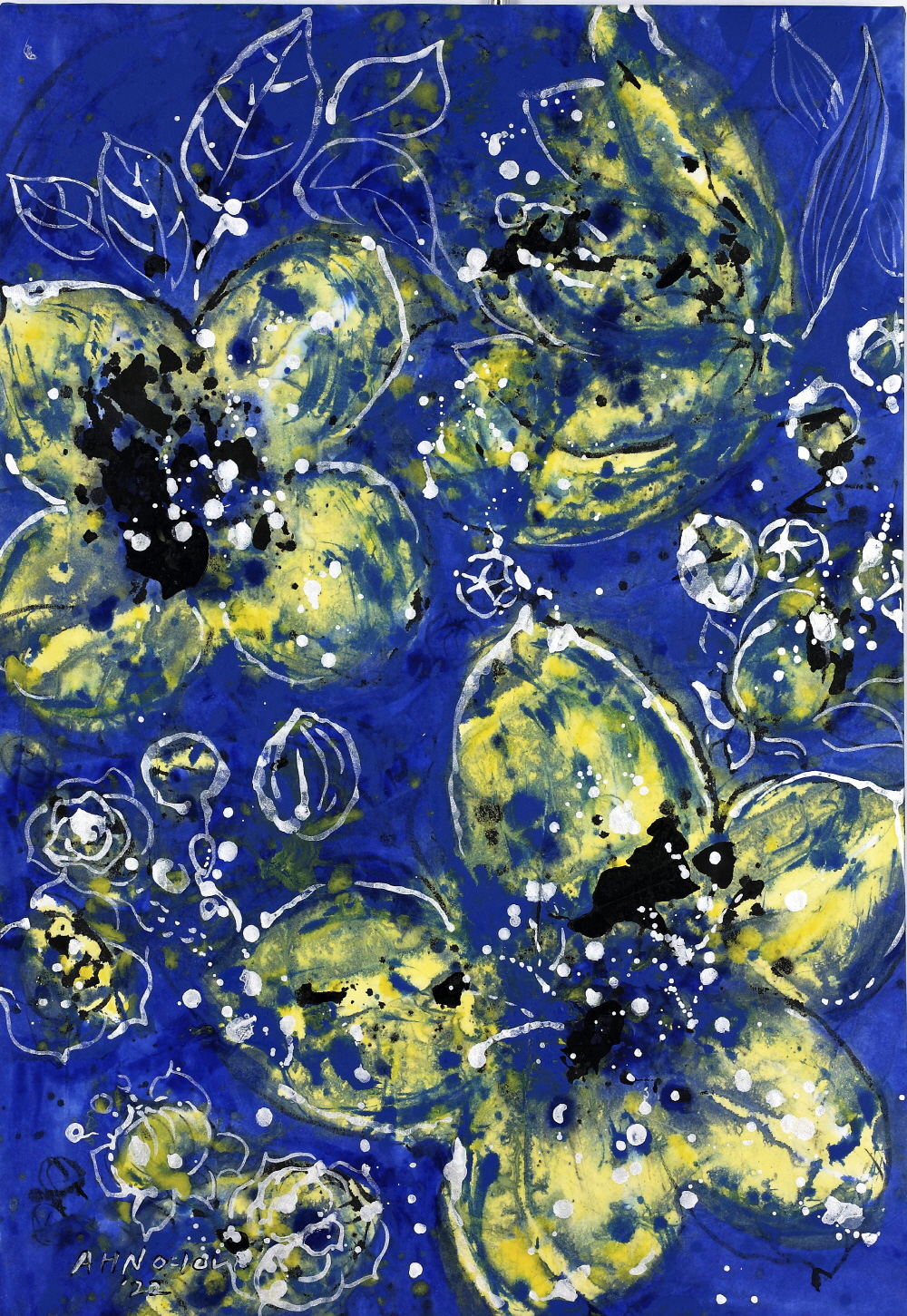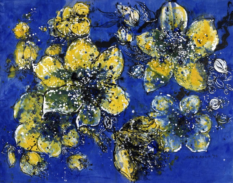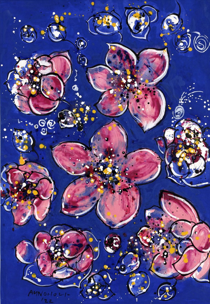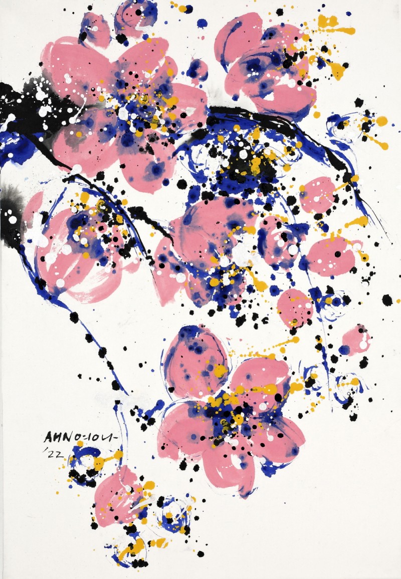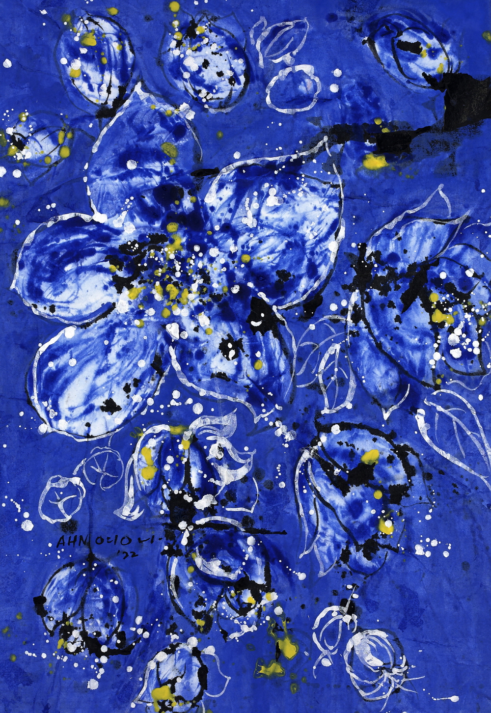 ‘Flower No Flower-꽃의 격려연작에 있어서 파란 꽃 작업은 수묵의 영역으로 해석되고 오방색의 파란색을 함유한 색채 표현의 한국화로 해석되기도 한다. 이 꽃의 표현은 빗자루와 비닐에 먹을 넣어 짜면서 뿌리는 드립핑(Dipping)기법으로 한지의 손맛을 표현하고 있는데 현대와 전통기법의 조화로운 모색이라 할 수 있다. 부연하면, 한국화의 기운생동과 지필묵의 방법론을 재해석한 것이 파란 꽃이다.