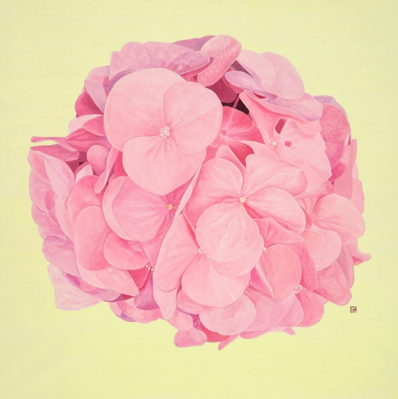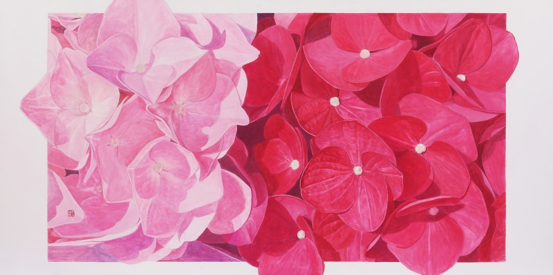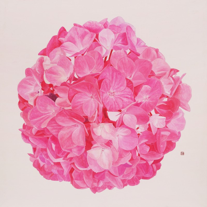 작가노트(2021) 제목: 꽃을 통해 삶의 여유를 느끼다.(A Peace of Mind Through Flower) 우리는 빠르게 돌아가는 세상에 살고 있고, 사회의 불안정과 고단함 속에서 안정과 균형을 바란다. 그래서 모두가 잠시 일상을 멈추고 자연과 교감하는 시간을 중요시하고 자연을 통해 힐링하고자 한다. 바쁜 현대인은 자연을 마주한 짧은 시간, 그 짧고 강렬한 순간에도 세상에서 여유를 느끼고 마음의 안정을 얻을 수 있는 것이다. 자연 중에서 꽃은 짧은 시간에 강력한 삶의 의미를 보여주며 그러한 이미지는 사람들에게 다양한 메시지를 준다. 봄에 피는 꽃에는 생명의 이미지를, 여름에 피는 꽃은 강렬한 삶을, 가을에 피는 꽃은 숭고한 이미지를 주는데 계절에 따라 꽃에 따라 저마다 색깔이 다르고 이미지도 다르지만 보는 이로 하여금 다양한 의미를 제공한다. 나는 목단, 백일홍 등 그간 다양한 꽃들을 그려왔지만 2013년부터 내가 꽃을 통해 전달하고픈 메시지나 주제는 항상 같아 왔다. 그러나 이번 전시는 꽃 중에서 최근 관심을 두게 된 여름에 피는 수국이다. 색채도 파랑, 보라, 핑크 등 종류가 다양하며, 이러한 다양한 색채들을 장지위에 분채로 강력하고 생동감 있게 표현하고자 하였다. 좀 더 강렬함과 생동감을 극대화하기 위해 배경을 단색으로 또는 여백을 두고 화면 중앙에 한 송이의 풍성한 꽃을 배치하여 사실적으로 표현하기도 하였고, 그리고 사각형의 프레임에 꽃을 넣고 그 프레임 밖으로 꽃을 배치하여 꽃이 상자에서 튀어나오는 듯, 한 이미지 표현은 꽃의 에너지를 실감 나고 강렬함을 느낄 수 있도록 하기 위한 것이다. 또 다른 방법으로 꽃을 확대하여 자세하게 볼 수 있도록 작은 굴곡들과 색의 변화를 통해 꽃의 생명을 생동감 있게 그려내어 수국의 또 다른 매력이 느껴지도록 표현하였다. 이러한 표현들은 결국 강렬한 수국의 생명을 바라보며 잠깐 꽃과 하나가 되어 삶의 여유를 주기 위한 것이다. 키워드: 여유, 수국, 프레임, 에너지, 꽃, 생동감