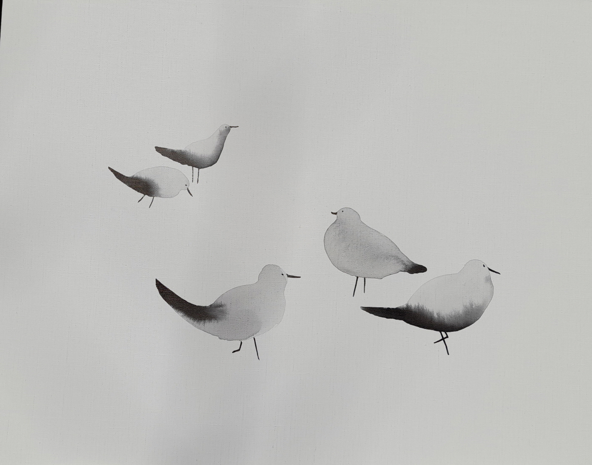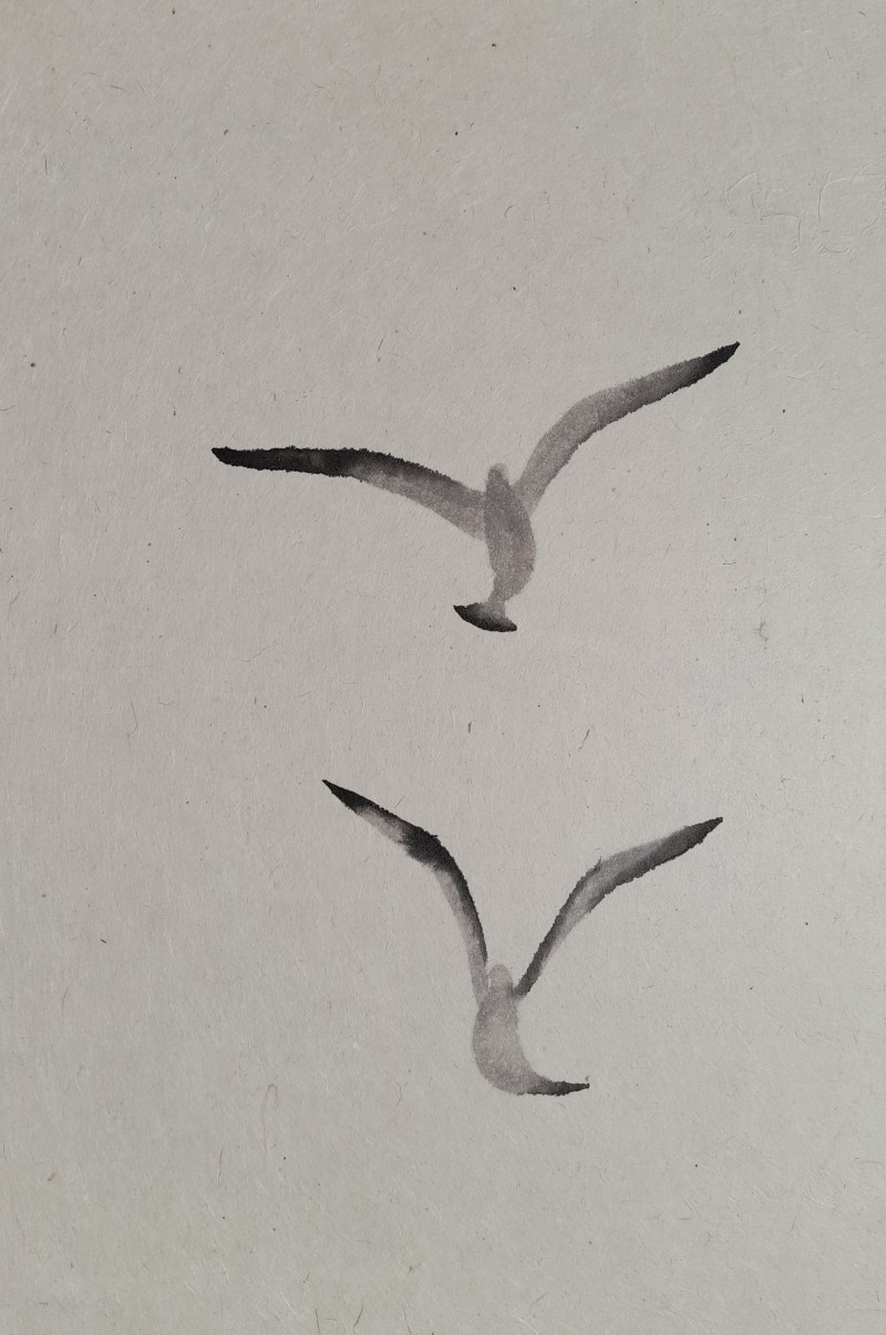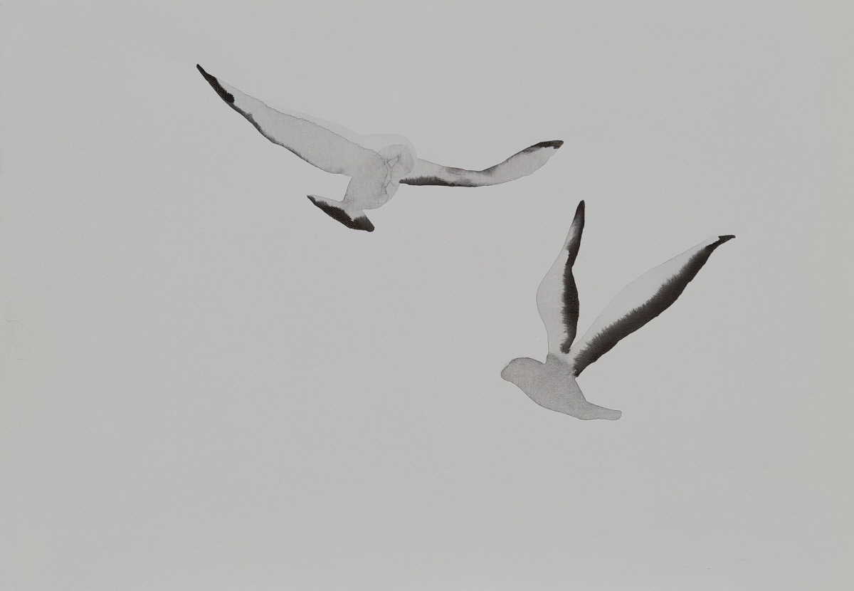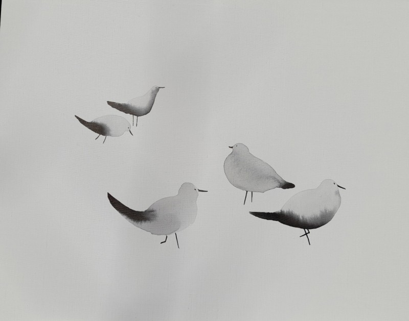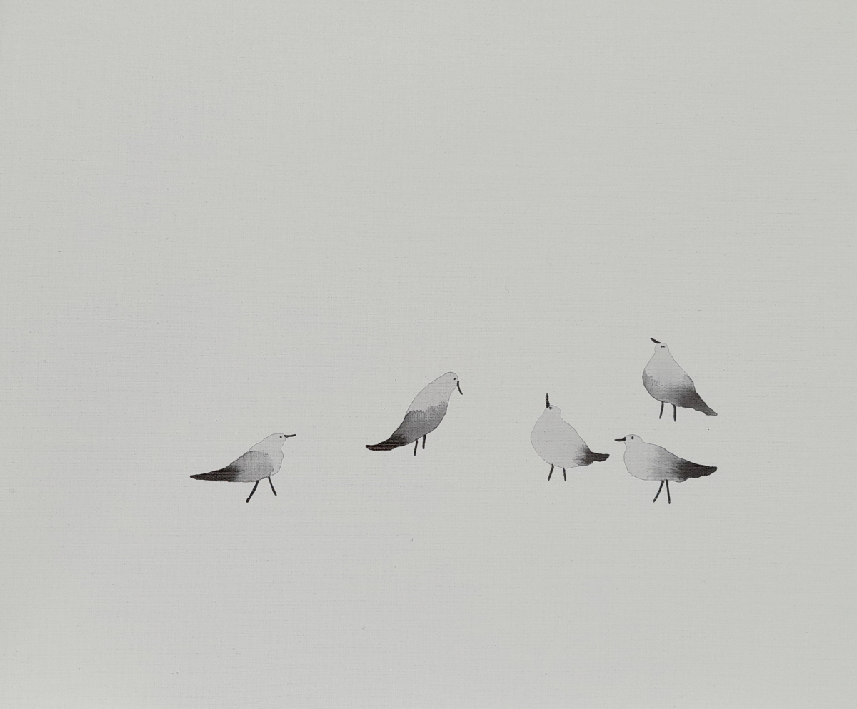 구맹이란 갈매기와의 맹세 란 뜻으로 은거하여 풍류를 즐긴다는 의미이다. 광안리 바닷가에서 갈매기를 보고 있노라면 그런 말이 생겨난 연유를 알 것도 같다. 요모조모 갈매기의 여러 모습을 먹의 얼룩을 이용하여 그려보았다. 소소하게 등장하던 기호들이 생략되고 빈 여백이 극대화 되었다. 갈매기의 모습에 좀더 집중하고 싶었기 때문이다. ‘자세히 보아야 예쁘다는 시인의 싯구가 적용되어야 할 것 같기도 하다. 여백은 창공이기도 하고 바다이기도 하고 백사장이기도 하다. 갈매기는 종종 걸음으로 해변을 거닐기도 하고 하늘을 둥실 떠있기도 한다. 물론 갯바위에 앉아 있거나 서있거나 바다에 동동 떠있기도 한다. 수묵화의 서예적 운필법에서 벗어나 좀더 유희적인 표현을 쓰게 되었다. 기법도 자유로와 졌지만 갈매기 조나단의 꿈을 떠올리게 하던 비상도와 은거 풍류인을 비유하는 구맹도가 상호 호환되는 점을 보면서 다른 두 개의 단어가 모두 자유라는 공통점을 지니고 있다고 깨닫는다.