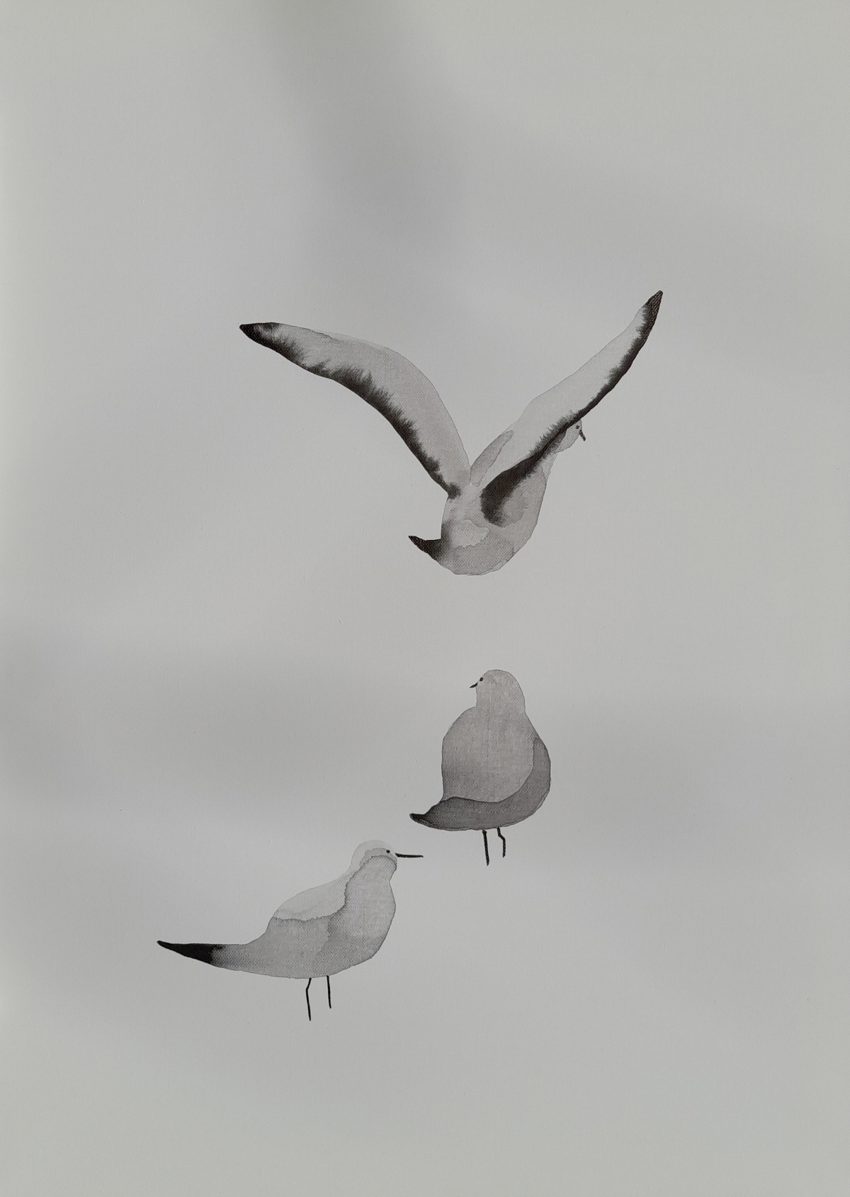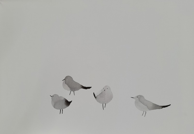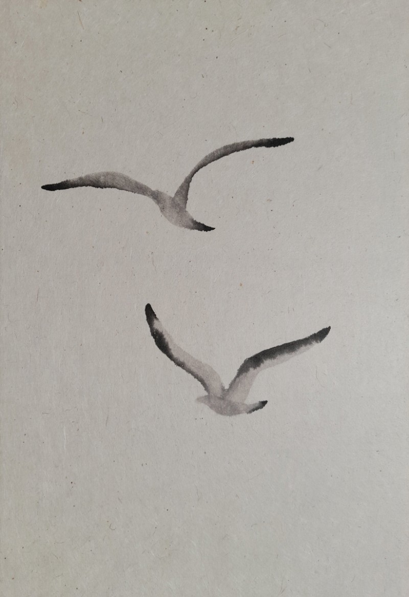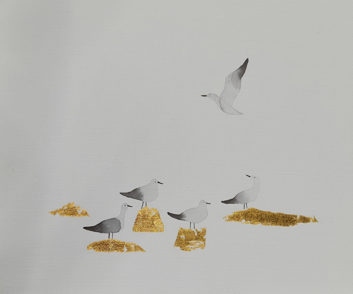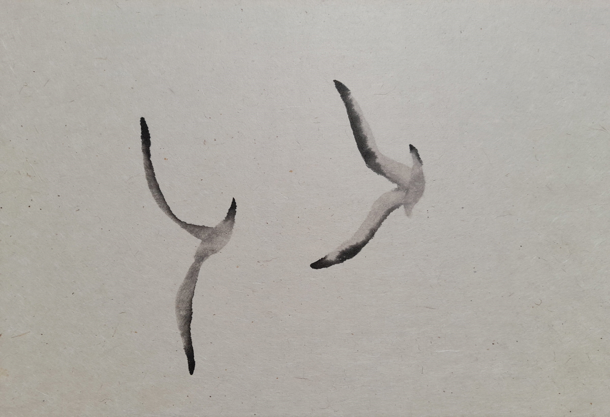 구맹이란 갈매기와의 맹세 란 뜻으로 은거하여 풍류를 즐긴다는 의미이다. 광안리 바닷가에서 갈매기를 보고 있노라면 그런 말이 생겨난 연유를 알 것도 같다. 요모조모 갈매기의 여러 모습을 먹의 얼룩을 이용하여 그려보았다. 소소하게 등장하던 기호들이 생략되고 빈 여백이 극대화 되었다. 갈매기의 모습에 좀더 집중하고 싶었기 때문이다. ‘자세히 보아야 예쁘다는 시인의 싯구가 적용되어야 할 것 같기도 하다. 여백은 창공이기도 하고 바다이기도 하고 백사장이기도 하다. 갈매기는 종종 걸음으로 해변을 거닐기도 하고 하늘을 둥실 떠있기도 한다. 물론 갯바위에 앉아 있거나 서있거나 바다에 동동 떠있기도 한다. 수묵화의 서예적 운필법에서 벗어나 좀더 유희적인 표현을 쓰게 되었다. 기법도 자유로와 졌지만 갈매기 조나단의 꿈을 떠올리게 하던 비상도와 은거 풍류인을 비유하는 구맹도가 상호 호환되는 점을 보면서 다른 두 개의 단어가 모두 자유라는 공통점을 지니고 있다고 깨닫는다.