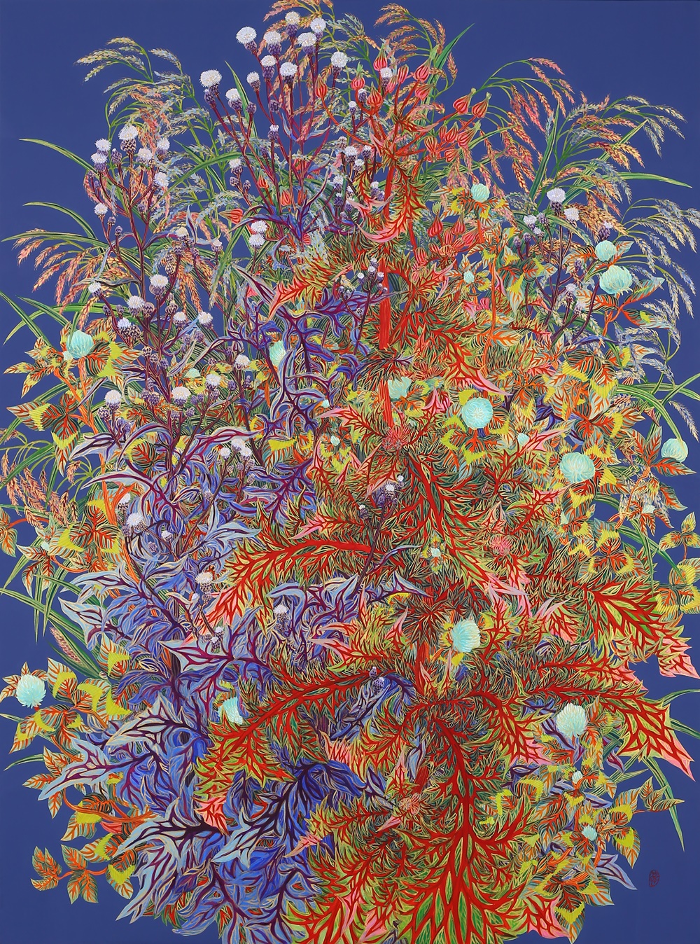 풀더미들이 이룬 오이코스는 더 이상 우리 발밑의 풀들이 아니다. 우리가 밟을 수 있는 미물이 아니다. 오이코스를 이룬 풀더미는 오히려 우리를 집어 삼킬 듯 군집하고 있다. 그러면서도 각자 자신의 위치를 갖는다. 화폭 속에서 저마다 앞으로 나오겠다며 아우성대지 않는다. 그저 자신의 에너지를 충분히 발산하면서도 자신의 위치를 지키며 어우러지고 있다. 오이코스는 생물학의 어원이 되는 단어이기도 하다. 고대 그리스에서 공적 영역인 폴리스와 구분되는 사적인 집단을 일컫는 이 말은 인간에게는 생물학적 기본단위인 가족을 포함한 정서적 그룹이기도 하다. 풀더미를 인간관계의 반영으로 표현한 성민우는 바로 이러한 풀의 오이코스를 그려내고 있다.