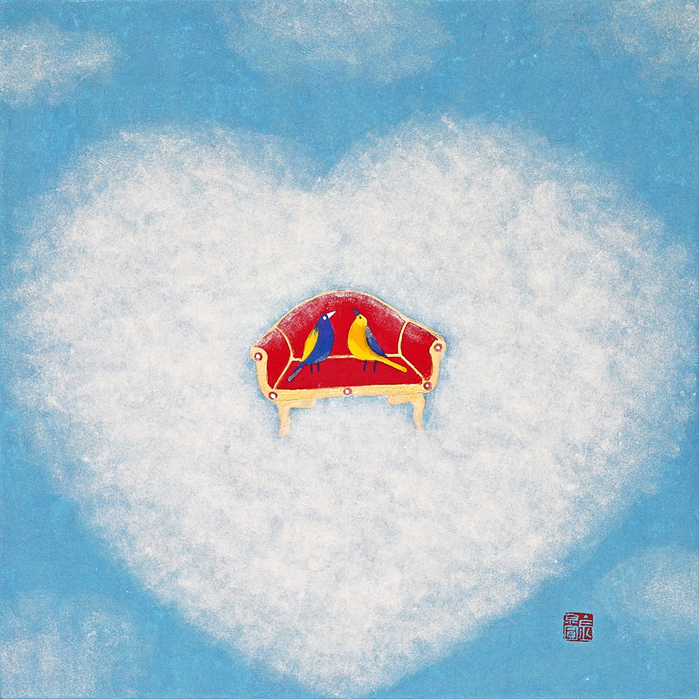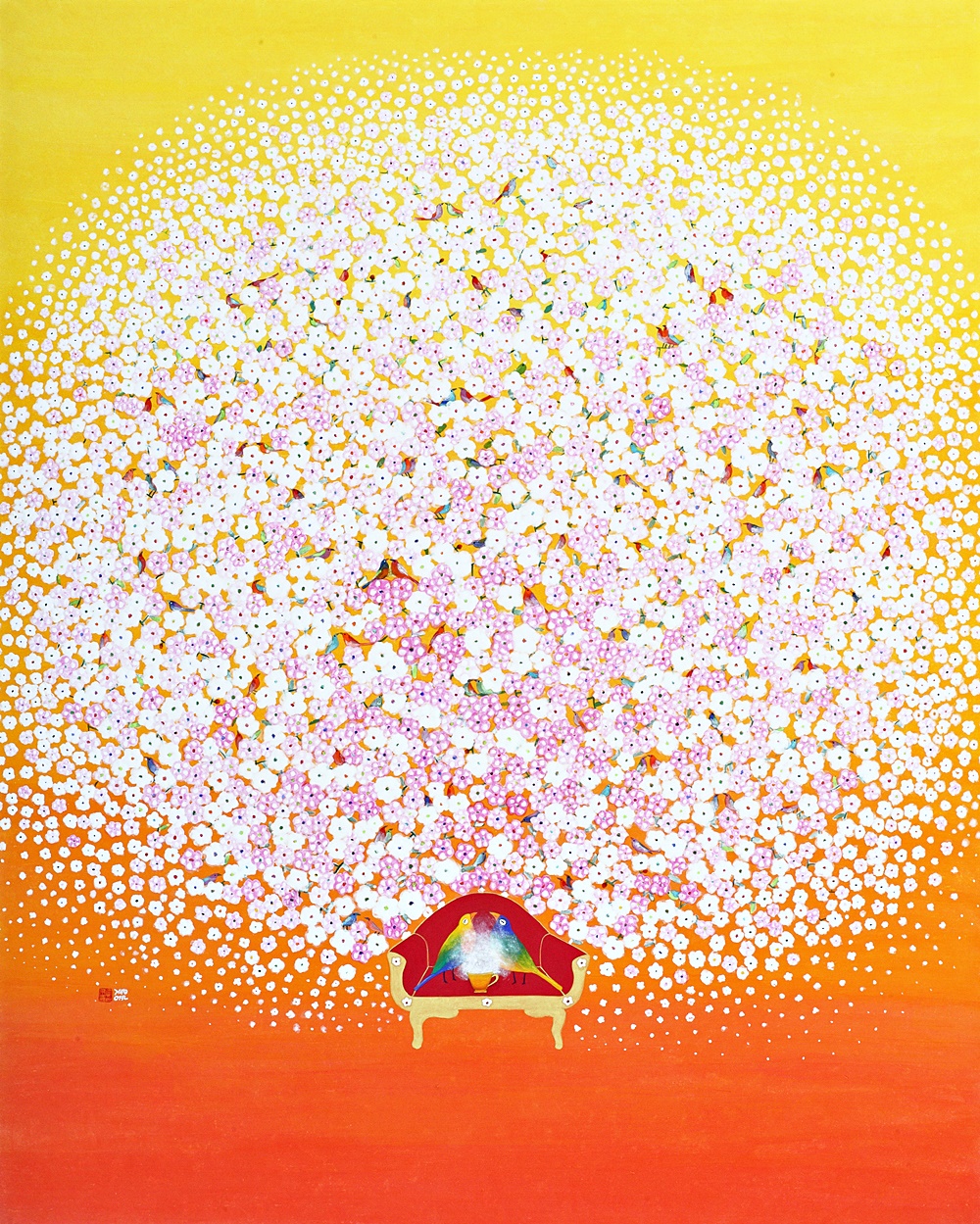 작품 속 새의 형상은 제각기 다른 모습으로 표출된다. 여러 감정을 노래하듯 그네들의 시선은 때론 경쾌한 때론 경건한 멜로디가 되어 마음을 움직인다. 크지 않은 작은 화단, 흰 꽃이 모여 조용히 빛을 내는 작은 공간 사이에서 꽃과 새는 동일한 크기로 만나 삶의 단면을 노래한다. 그 모습은 어떤 구속도 없는 자유로운 세계를 담았다. 걸리는 것도, 집착하는 법도 없다. 이 꽃에 앉았다가 다른 꽃으로 이동하는 자유로움 속에서 작가는 무엇 하나 자유로울 수 없는 우리네 삶을 위로하고자 한다. 초창기의 새는 딱딱하고 날카롭고 왜곡된 의식화된 새의 형상이었다. 40대 초반 다시 시작한 작업에 대한 갈망은 오로지 배워야겠다는 의지로 채워져 있었다. 기존체제의 답습과 수묵담채식 추상작업으로부터의 탈피는 ‘왜곡된 형상의 새’로 현실화 되었다. 무거운 현실과 삶의 숙제들은 야생화를 발견한 시기와 맞물려 조금씩 벗어나기 시작했다. 이른바 자기화된 작업의지는 세상을 향한 관심 전체를 변화시켰다. 칸딘스키가 자신의 뒤집어진 작품에서 깨달음을 얻었던 것처럼 생각의 전이는 창밖의 소리로부터 찾아들었다. 원래 살던 곳에서 느끼지 못했던 공기와 자연을 느끼기 시작하면서, 상큼한 향기와 같은 새의 지저귐이 작가의 마음에 내려앉았다. 하지만 그 안에서 실제 새는 발견되지 않았다. 육체적·정신적으로 힘들던 시기, 예견 없이 찾아온 새의 지저귐은 맑고 몽롱한 내면의 소리가 되어 작품으로 승화된 것이다. 현실과 맞닿은 이상화된 세계 최근 작업에서는 기존 작업에서 볼 수 없던 두 가지 요소가 가미되었다. 첫째는 개별적으로 흩어져 있던 꽃이 통일감 있는 하나의 형상을 이루었다는 것이다. 의인화된 문인의 시각을 현대화된 음율(새가 시를 읊조리는 느낌)로 표방한 느낌이다. 색감 역시 전통 오방색(五方色)을 현대화시킨 모습으로 재해석 되었다. 공허하고 슬프다는 것은 참고 살아온 인생이었음을 반증한다. 작가는 2014년의 개념화된 <추억의 정원>시리즈에서 지우고 지워내는 작업을 보여준 바 있다. 기존 작업이 슬픈 정서를 녹여냈다면, 현재 작업은 기쁘고 유려하다. 작가는 유년시절 집에 놓여 있던 모란꽃 장신구들과 앞마당에 피어있던 작약의 화려함을 기억해냈다. 하나의 꽃으로 형상화된 작은 꽃의 세계는 견뎌온 세월을 향한 긍정적인 보상을 의미한다. 그래선지 작품은 미세한 부분까지 작가의 마음을 녹여낸다. 들꽃(야생화)에서 매화로, 좀 더 화려한 꽃으로, 앞으로 작가는 삶을 변화시키고자 하는 의지를 꽃의 변화상을 통해 드러낼 것이다. 둘째는 작품 안에 일종의 데페이즈망(dépaysement; 전치(轉置), 전위)이 사용된다는 점이다. 왕좌(王座)를 떠올리는 화려한 의자 위에 새들은 다채로운 모습으로 내려앉아 화면 속 꽃의 세계를 바라본다. 화려한 의자가 등장했다는 것은 왕의 귀환과 같이 ‘가장 아름다운 시절(La belle époque)’을 요청하는 동시에, 휴식 같은 여유를 취하고자 하는 결연한 의지를 보여주는 것이다. 시인 로트레아몽(Lautréamont)은 꽃·새·의자 등을 표현한 초현실적 기법에 대해 ‘재봉틀·박쥐·우산과 같은 전혀 관계없는 물체들이 해부대 위에서 우연히 만난 듯한 아름다움’이라고 표현한 바 있다. 낯익은 물체를 일상적인 질서에서 떼어내 이처럼 뜻하지 않은 장소에 놓는 행위, 바로 이러한 우연성은 달리의 시계처럼 우리의 시·공간을 경이와 신비에 가득찬 무의식의 세계로 인도한다. 작가의 마음 속 깊이 잠재해 있던 무의식의 세계를 해방시키는 창구, 의자는 우리에게 다른 삶으로 인도하는 하나의 탈출구인 셈이다. “그림을 그리는 과정은 나 자신을 발견해가는 과정이었습니다. 작품을 하면서 위안을 받았던 것처럼, 내 그림을 보는 사람들이 작품 속 의자 안에서 편히 쉬어 갈 수 있기를 바랍니다.” - 작가노트 중에서