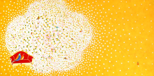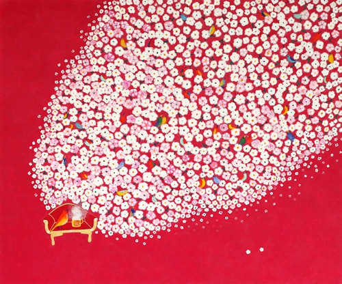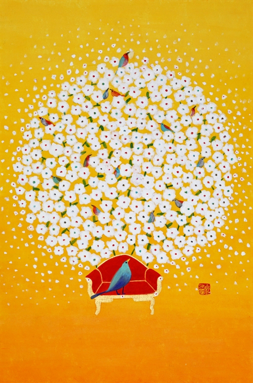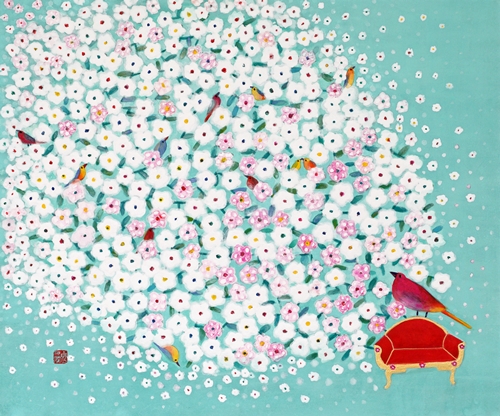 최근 작업에서는 기존 작업에서 볼 수 없던 두 가지 요소가 가미되었다. 첫째는 개별적으로 흩어져 있던 꽃이 통일감 있는 하나의 형상을 이루었다는 것이다. 의인화된 문인의 시각을 현대화된 음율(새가 시를 읊조리는 느낌)로 표방한 느낌이다. 색감 역시 전통 오방색(五方色)을 현대화시킨 모습으로 재해석 되었다. 공허하고 슬프다는 것은 참고 살아온 인생이었음을 반증한다. 작가는 2014년의 개념화된 <추억의 정원>시리즈에서 지우고 지워내는 작업을 보여준 바 있다. 기존 작업이 슬픈 정서를 녹여냈다면, 현재 작업은 기쁘고 유려하다. 작가는 유년시절 집에 놓여 있던 모란꽃 장신구들과 앞마당에 피어있던 작약의 화려함을 기억해냈다. 하나의 꽃으로 형상화된 작은 꽃의 세계는 견뎌온 세월을 향한 긍정적인 보상을 의미한다. 그래선지 작품은 미세한 부분까지 작가의 마음을 녹여낸다. 들꽃(야생화)에서 매화로, 좀 더 화려한 꽃으로, 앞으로 작가는 삶을 변화시키고자 하는 의지를 꽃의 변화상을 통해 드러낼 것이다.