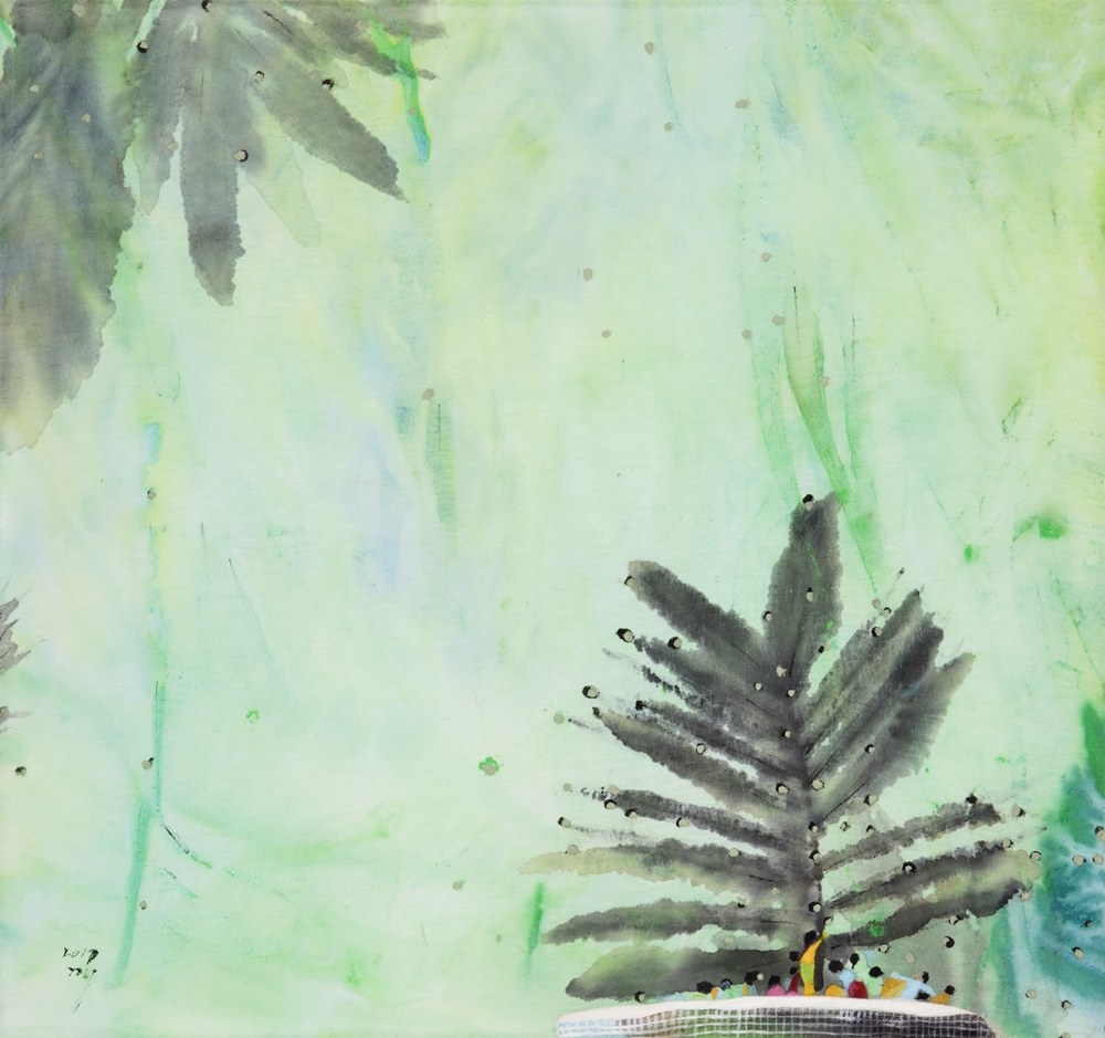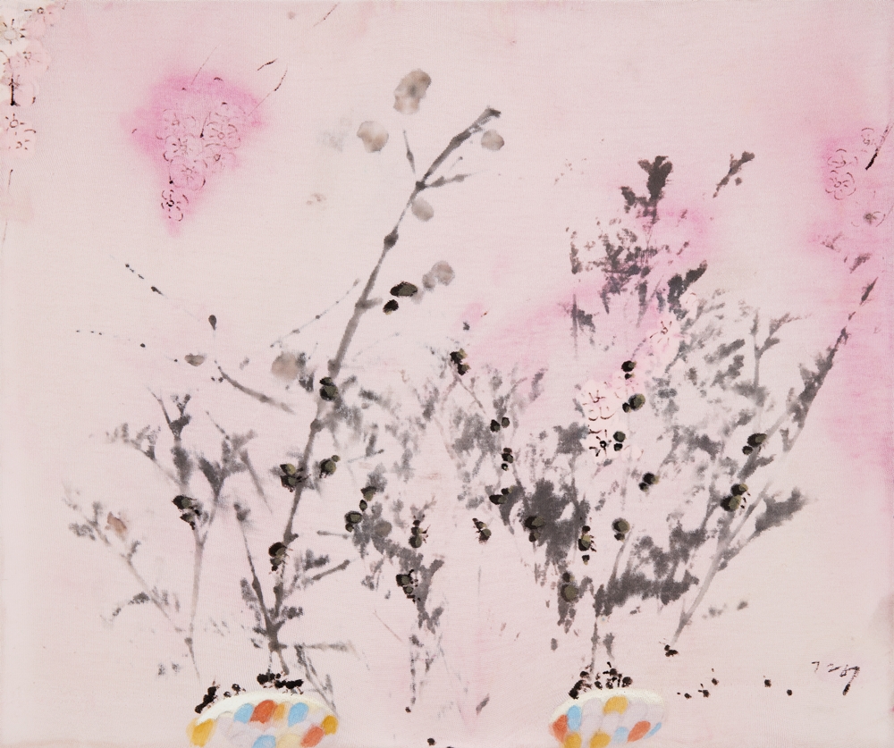 김경이는 메리야스나 면천 위에 흠뻑 적신 물과 채색, 먹 선을 이용해 나무, 식물이 있는 풍경을 그렸다. 천에 묽어진 물감이 곧바로 스며들게 하는 것이자 화면과 일체화 시키는 방법론에 의한 그림이다. 그것은 화면의 평면성을 극대화하는 동시에 물의 농도와 시간이 그림을 지배하게 한다. 이른바 자연적 조건, 그리고 인위성보다도 우연성에 입각한 그림이라는 얘기다. 먹과 안료의 물리적인 물성과 면천의 표면적인 물성이 서로 얽혀 들어가 이미지를 만들고 상황을 전개시킨다. 이것은 작가의 의도 이전에 무엇보다도 재료의 물리적 속성과 시간, 우연 등이 어우러져 만든 결과일 것이다. 아마도 이런 것이 동양화 재료가 갖고 있는 본연의 속성이자 무위내지는 물화하고 부르는 동양미술의 핵심적인 성격에 해당하는 지도 모르겠다.