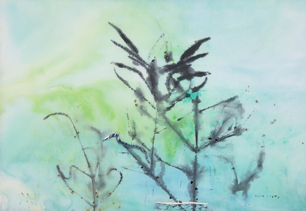 작가는 회화 표면을 지극히 얇게 만들어 이룬 공간에 담묵과 묽은 채색이 깊숙이 스며들어 심연 같은 공간을 자아낸다. 그러면서도 번짐으로 인해 색채로 환해지는 공간을 열어놓는다. 눅눅하고 축축한 화면은 어렴풋하고 명료하지 않고 온통 희미하게 번지고 퍼지고 스며들어서 선명한 윤곽선이 부재한 상태에서 얼룩으로만 자리하고 그것들이 모여 희박한 이미지이자 사라지기 직전의 이미지, 혹은 기억 속의, 마음속에 얼핏 스쳐지나간 이미지 같은 것을 남겨놓았다. 앞서 언급했듯이 점경으로 인물의 뒷모습이 박혀있고 화분과 돌담, 축대 등을 연상시키는 구조물이 놓여 있다. 작은 화면에 새나 뱀, 고양이 등도 숨듯이 개입되어 있다. 자연과 인간이 공존하고 풍경과 생명체들이 두루 얽힌 장면이다. 그것은 오늘날 도시의 주변에서, 일상에서 익히 접하는 자연풍경이다. 그 풍경은 자연에 대한 인식과 상념을 부풀어주는 매개이자 이전의 추억으로 간직한 풍경, 무의식의 저간에 깔려있는 원형으로서의 자연 풍경을, 고향의 공간을 문득 건드려주기도 한다. 그것은 단지 지난 시간을 호명하는데 멈추지 않고 과거와 현재의 두 시간이 충돌하면서 서로 다른, 달라진 자연풍경이 겹쳐지고 여기에 안타까운 상실의 감정과 본래의 자연을 상기시켜주는 통로가 된다. 그렇게 작가는 본래의 자연을 떠올려보았다고 한다. 모종의 상실과 안타까움 그러면서도 여전히 자신의 곁에 있어준 자연에 대한 감사의 마음 등이 복합적으로 작용하고 있는 그림이다. 그렇게 작가는 수시로 자신의 삶으로, 가슴으로 돌아오는 자연, 이른바 재귀하는 자연을 그리고 있는 것이다.