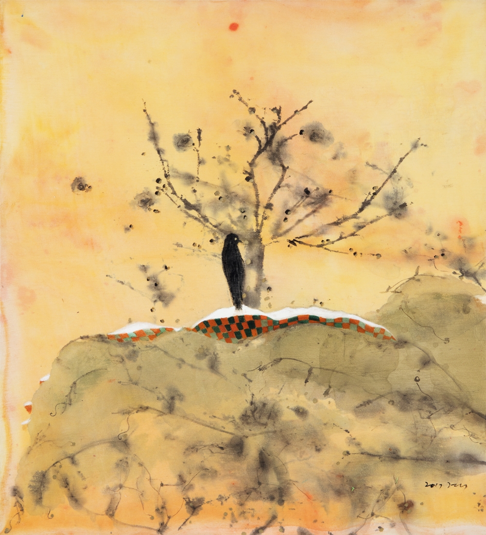 김경이의 그림 속에는 희미한 형태로 자연의 이미지가 놓여있다. 그 자연 역시 산수화가 담고 있는 풍경의 숨결이 흐르고 있고 우주의 화음이 흐르는 듯하다. 아니 그것을 그리고 싶었을 것이다. 더불어 자연에 대한 추억의 장면, 절실한 기억의 자취를 안쓰럽게 길어 올리고자 했을 것이다. 그로인해 화면에는 나무와 풀, 새와 짐승, 그리고 덧붙여 축대 등 인위적인 구조물과 인물들이 그려져 있다. 하늘과 땅, 사물과 사물이 경계는 희박하고 모호하다. 공간은 모종의 기운으로 한껏 적셔져 있고 시간과 계절의 속성, 햇살과 바람과 안개 등의 기후적 요소들이 힘껏 개입되어 있는 형국으로 가득하다. 가시적 존재와 비가시적 존재로 꽉 차있는, 그런 공간이다.