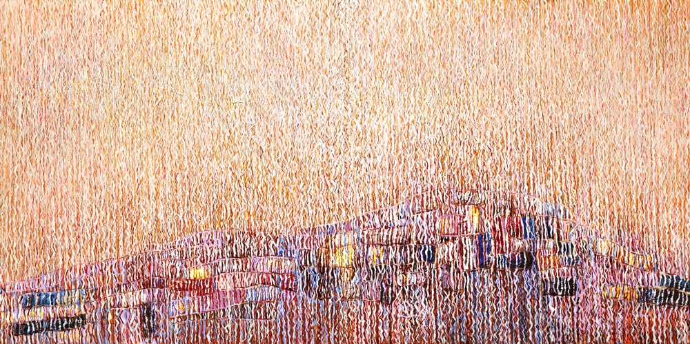 Chae works in a unique way to make her oil paintings, adding wool thread to her otherwise conventional canvas. Using wool produce a fluid wave of veil-like texture over the paintings, softly covering the pictorial elements underneath it. This veil-like silky texture reflects light, creating a dreamy atmosphere with the soft shimmer. The overall effect produced is like seeing a beautiful hand sewn tapestry strand by strand.