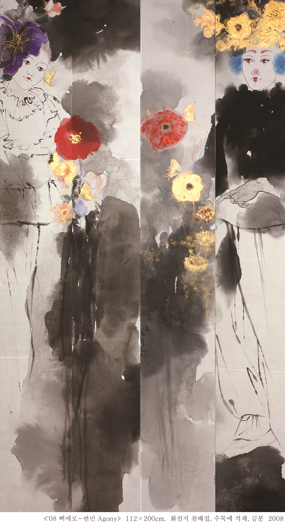 Ⅰ. 사회 및 자신의 지향과의 괴리: 은현(隱現)·장로(藏露)의 숨김(隱·藏)의 미학에서 드러냄((現·露)의 미학으로: 2007년 전시가 ‘숨김과 드러냄(隱現,藏露)의 미학’중 숨김(隱·藏)의 미학이 主였고, 인물화 화면과, 발묵(潑墨)과 발묵의 흔적에 靑·紅·黃色 점이 있는, 마치 하늘의 현색(玄色)인 듯한 다양한 먹빛화면들을 붙여 자신의 이상과 사회현실과의 괴리를 감성적으로 극화(極化)한 자신의 구사(構思, 즉 구상)를 한지에 천배접을 한 후 수묵(水墨)과 석채(石彩), 채색, 금니(金泥)로 실현하던 수묵·채색화는 옆에 붙은 먹빛화면이 탈춤의 소매의 일부로 이어지면서 그 하늘이 다른 하늘이 아니요 그녀의 하늘임을 밝혔었다. 그러나 2008년부터 그러한 연관이 사라지고, 폭 수와 크기가 줄고 채색이 강화되면서, 일폭화로 진행되거나 인물이 강하게 자기를 주장하면서 하늘의 역할은 더 강화되었다. K. 해리스(Harris)가, 서양 현대에서 초상화가 사라진 이유를 인간에 대한 ‘존경’이 사라졌기 때문이라고 보았듯이, 한국화에서도 인간에 대한 존경이 사라진 듯, 국전시대에 맹위를 떨치던 인물화가 사라졌고, 있어도 왜곡되거나 변형되었다. 이제 인물화는 동서양 모두에서 신(神)이나 자연이 아니고, 인간이 인간을 변형시키고 왜곡하는 작은 신(神)이 되었다. 중국회화의 전성기인 북송 말 선화화단(宣和畵壇)에서 수묵산수화와 채색화조화의 번창에도 인물화·도석화가 양적으로 가장 많았던 것은 세상의 주인이 여전히 인간이었다는 반증이요, 한편으로는 그 당시 인물과 안마(鞍馬)를 포용할 수 있는, 이공린의 백묘화(白描畫)같은 창안이 있었기 때문에 가능했다고 생각된다. 그러나 80년대 이후 한국에서 추상화가 번창하면서 서양화, 즉 피카소의 <아비뇽의 처녀들> <게르니카>에서처럼 대상의 왜곡, 변형과 달리, 시간이 갈수록 인물이 거의 사라졌다. 그러나 한국화에서도, 서양 현대처럼 현대를 대변하는 해석과 표현방식의 창안이, 즉 현실에 근거한 창안이 필요하다고 생각된다. 그러한 의미에서 유희승의 그림은 전통의 현대적 창안이라는 면에서 또 하나의 예의 탐구로 적절하리라 생각된다. 단독인물상의 조합에서 군상(群像)의 수묵 선화(線畵)으로의 회귀와 채색 화훼화·인물화에 삽입된 화훼화: 상술한 2007년 전시의 ‘숨김과 드러냄(隱現,藏露)의 미학’은, 2008-9년 이후에는 그녀에게 세상에 대한 자신감이 회복된 듯, 인물화면이 독립인물상으로 독립해 먹빛화면의 도움을 받지만, 그들 두 화면의 ‘나뉨과 합함(分合)’은 자유분방한 역할이 줄고, 짙은 발묵의 먹빛 화면의 하늘의 역할이 강조되나 그 괴리만, 어두움만, 커졌다. 괴리의 해결 시도인 듯, 얼굴을 숨겼던(隱,藏) 짙은 화장, 피에로의 화장, 탈, 고깔 등의 요소들이 사라지는 현대여성의 ‘드러남(現·露)’의 미학이 시작되면서, 여인의 머리부터 아래로 이어지는 금빛이나 채색 새의 화려함은 그녀의 불안의 역설적 표현이거나 어떤 ‘영원’에 대한 염원이 자리 잡은 것이 아닌가 하는 생각이 들고, 전통 초상화에서의 정면상의 등장, 인물에 불보살(佛菩薩)의 원형 두광(頭光)이나 원형 신광(身光)의 등장, 인물의 얼굴을 네모 화면으로 둘러싸는 이중, 삼중화면 등은 그러한 ‘드러남’의 미학으로 여인의 심상의 괴리, 즉 화의(畵意)의 간극의 심화를 역설적으로 표현한 것으로 보인다. 그러나 2012년 화훼화나 화훼절지(花卉折枝)에서는 2007년의 인물화면처럼 먹빛화면을 동반하나, 2008-9년처럼 먹빛 화면에 또 더 짙은 먹빛화면이 들어가는 이중화면이라든가, 발묵의 색이나 먹으로 형과 색이 흐려지거나 원형, 마름모형이 등장하기도 하는데, 이러한 분합이나 화면의 변화는 그녀의 세상을 보는 시각이 변했음을 보여준다. 서양화에서는 새나 꽃은 ‘금방 사라짐’의 알레고리로 쓰였으나, 그녀의 그림에서는 아름다운 채색 화훼화로 독립된 꽃들은 대상을 사회현상전체로 이해하기보다는 어떠한 어려움에도 매년 철이 되면 피는 꽃의 성(性), 즉 ‘자연(自然)’을 금니로 ‘영원’을 상징하고, 옛 화조화처럼 잠깐 아름다운 꽃으로 눈을 돌리면, 그녀가 말하듯이, 그 화려하고 아름다움이 우리에게 ‘위로’,‘평화’‘자유’‘사랑’이 되어, 그녀의 간극은 그러한 ‘자연’으로 보상되었다. 그러나 꽃과 새, 나비는 몰골(沒骨)의 색이 동양화의 궁극목표인 ‘평담(平淡)’이기는 하나 아직 ‘간솔(簡率)’로는 가지 못해, 사회의 엄중함은 아직 괴리의 해결 과정임을 보여준다. 한편 성장한 여성그림에서는 발묵이 농색으로 강화되고, 옆에 붙은 먹빛화면도 다양해져, 하늘의 역할은 더 커지고 다양화되었다. 여인은 심해지는 불안을 역설적으로 짙은 화장으로 덮거나 양귀비 등의 화려한 적(赤)·황색(黃色)의 절지(折枝) 꽃과 새, 나비로 성장(盛裝)하고, 얼굴만의 소(小)화면의 크로즈 업이 등장하는가 하면, 그들 절지(折枝)의 붉은 양귀비, 노랑·파랑 꽃이나 화분에 심겨있는 매화, 절지 매화, 청화백자 속에 꽂혀 있는 모란이나 양귀비는 화훼절지(花卉折枝)로 분화하고, 2012년부터는 자기(磁器) 화분에 담기거나 화병에 꽂혀 있는 