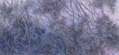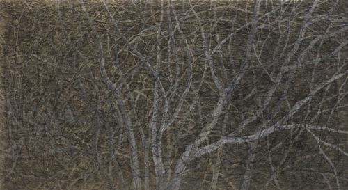 이제 <엉키고 엉켜진>(2017), <뒤엉킴>(2017), <뒤엉킨 순간>(2017)들이 구현하는 얽힘의 양상을 확인해보자. 이 작품들에서는 이른바 ‘형상-배경의 법칙’(figure & ground law), 즉 배경(ground)로부터 형상(figure)을 끌어내는 식으로, 전경(前景)과 후경(後景)을 구별하고 주어진 세계에 질서를 부여하는 지각방식이 원활하게 관철되지 않는다. 우리 눈이 그림의 어떤 부분을 형상으로 삼아 주목하려 하면 곧장 다른 부분이 앞으로 나오고, 그러면 또 다른 부분이 앞으로 나오는 식이다. 심지어 배경으로 간주할 수 있는 부분조차 두툼한 질감을 지니고 있기에 형상으로서의 권리를 주장하는 것처럼 보일 정도다. 따라서 이 작품에서는 느긋하고 편안하게 관조하며 여백의 미를 만끽하는 식의 감상이 사실상 가능하지 않다. 대신 감상자는 자신의 살아있는 몸을 수행하는 식으로, 즉 작품에 밀착하여 눈으로 그것을 더듬는 식으로 그 “엉키고 엉켜진” 것들, “뒤엉킨 순간”들을 만나야 한다.