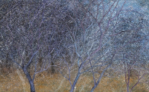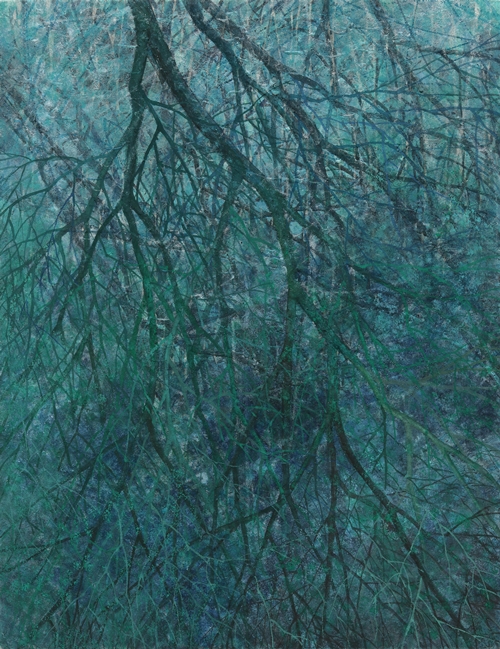 2015년에 열린 개인전 <The Moment>에서 김은진은 “나무들”을 그렸다. 그렇지만 나는 당시 김은진의 작품을 간단히 ‘나무 그림’으로 지칭할 수 없는데 여기에는 이유가 있다. 일단 이 작품들에서는 비물질, 비대상이라 할 “빛”이 유난히 눈에 들어온다. 김은진 자신의 표현을 빌자면 그것은 “달빛을 받아서, 하얀 눈빛을 받아서, 혹은 가로등 아래에서, 은은한 불빛에 빛나는”(2015, 작가노트) 모습들이다. <The Moment>의 주무대인 ‘밤’은 빛이 돋보이는 순간이다. 특히 눈 쌓인 겨울밤은 빛의 존재감이 가장 두드러진 시-공간에 해당한다. 게다가 2015년의 김은진은 방해말(方解末)을 써서 그 빛에 물질성, 실질성을 부여했다. 화가의 덧붙이는 행위로 인해 그림 표면에 방해말과 함께 엉겨 붙은 금박과 은박들의 “반짝반짝 빛나는” 현상을 언급할 수도 있다. <The Moment> 연작들(2015)에서 나무의 거친 질감들, 그 숲의 검붉은 색채와 음영들은 확실히 빛의 지각적 체험과 불가분의 관계에 있었다. 빛 체험은 몸의 감각과 얽혀있다는 점에서 이 작품들을 “빛의 효과로 창출된 순간적이고 신체적인 공간에 대한 탐색”으로 해석할 수도 있을 게다.