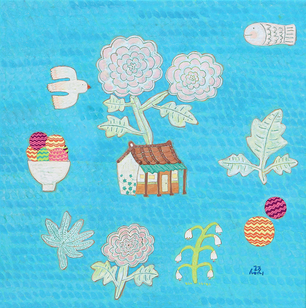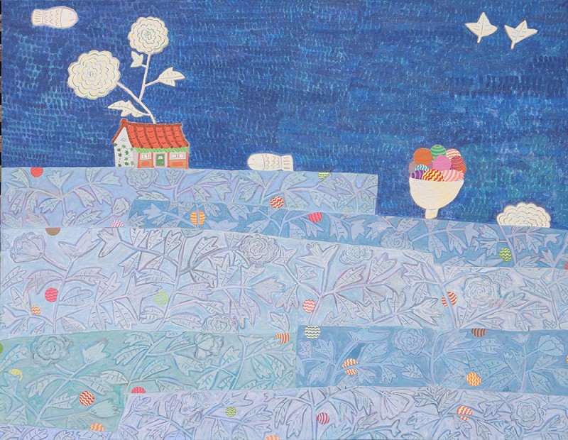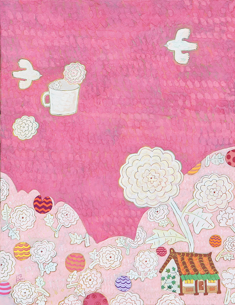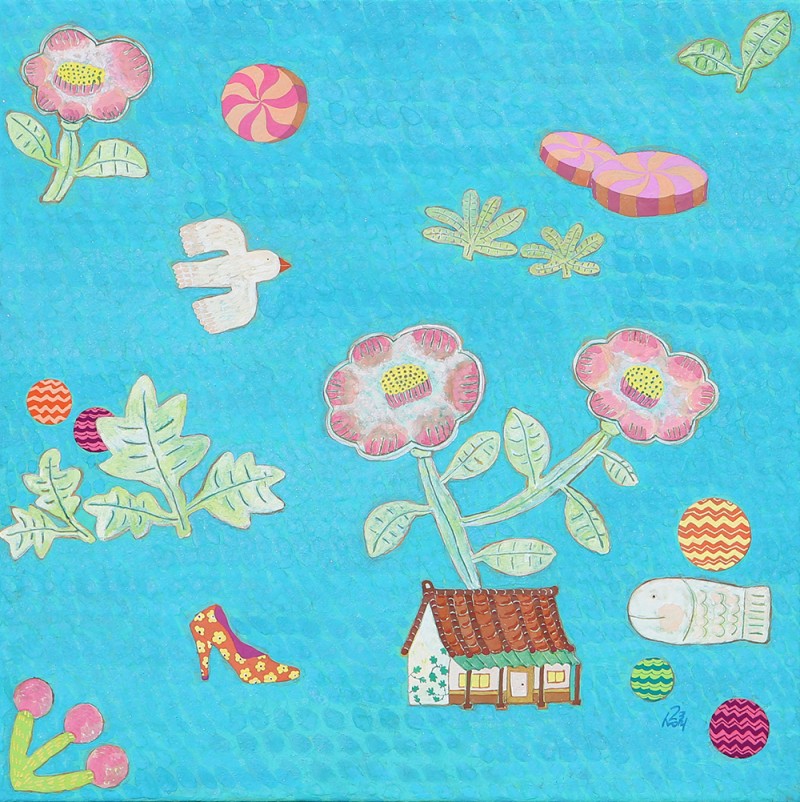 장지壯紙의 바탕에 무수히 많은 반복적인 붓질로 색을 얹어나가는 과정을 거쳐야만 완성될 수 있다. 여러 번의 바탕 채색으로 얻은 중첩된 느낌은 그 자체로 시간의 집적集積을 의미한다. 그 위에 서로 다른 조형 요소를 가진 이질의 개체가 만나 조화로운 관계를 형성하고 새로운 어울림을 만들어 낸다. 시간의 집적 안에서 그것들의 조우는 스스로의 의미를 넘어서게 한다. 그리고 그 만남으로 생긴 새로운 일들이 나의 그림에서 펼쳐지고 있다. 그 새로운 일은 은근히 창조적이며 사랑스러우며 보는 이를 긴장하게 한다