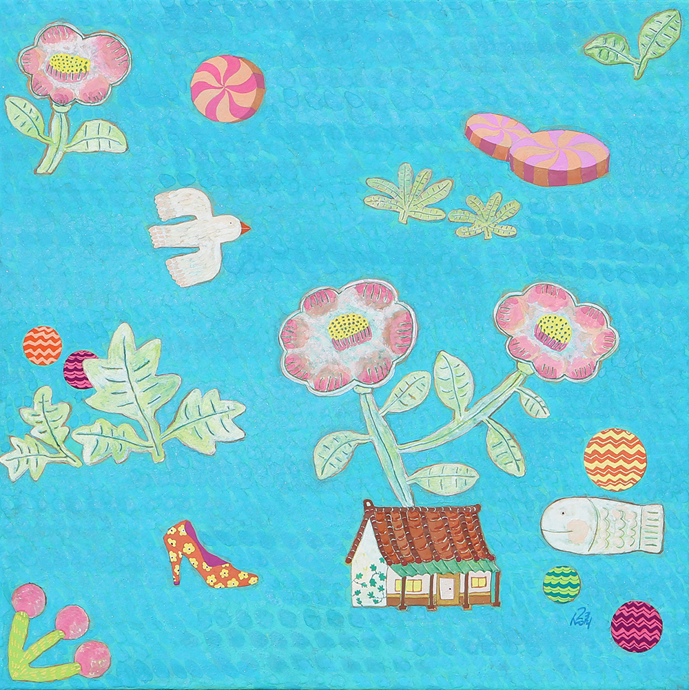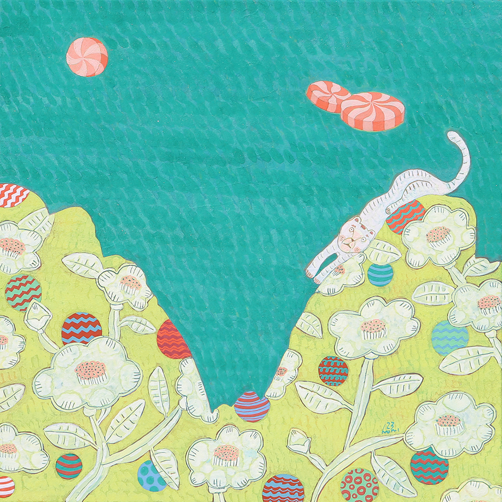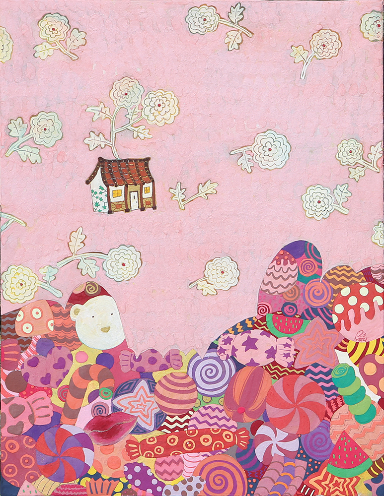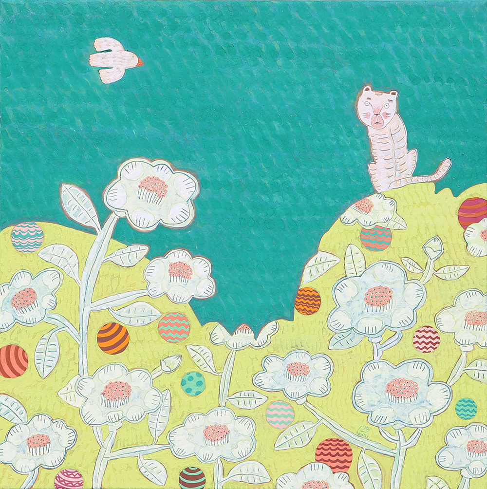 장지壯紙의 바탕에 무수히 많은 반복적인 붓질로 색을 얹어나가는 과정을 거쳐야만 완성될 수 있다. 여러 번의 바탕 채색으로 얻은 중첩된 느낌은 그 자체로 시간의 집적集積을 의미한다. 그 위에 서로 다른 조형 요소를 가진 이질의 개체가 만나 조화로운 관계를 형성하고 새로운 어울림을 만들어 낸다. 시간의 집적 안에서 그것들의 조우는 스스로의 의미를 넘어서게 한다. 그리고 그 만남으로 생긴 새로운 일들이 나의 그림에서 펼쳐지고 있다. 그 새로운 일은 은근히 창조적이며 사랑스러우며 보는 이를 긴장하게 한다