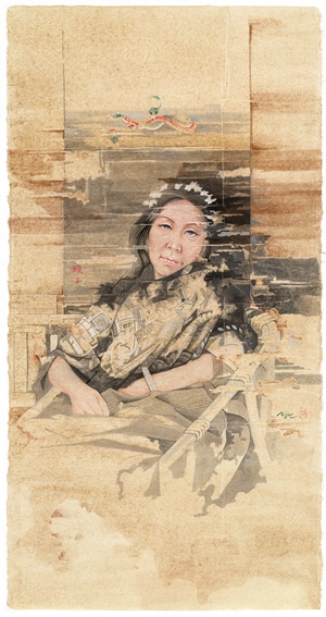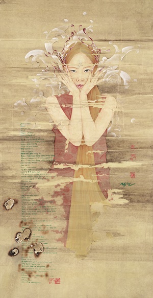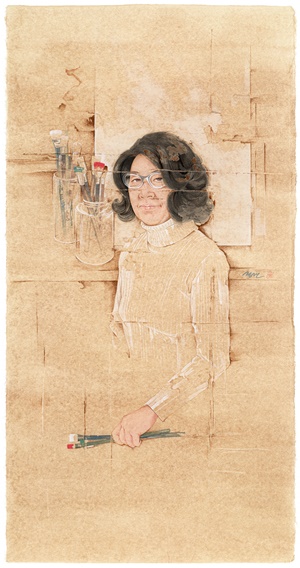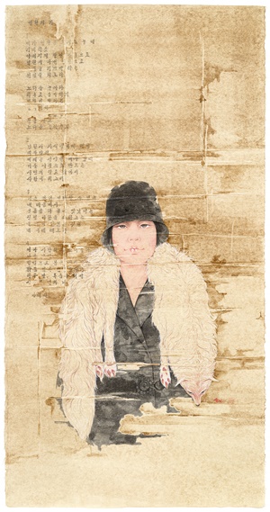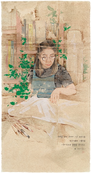김정란 작가는 오랫동안 여성 초상화를 그려왔다. 2010년에는 <20세기 미인도> 전시를 통해 당시 왕성하게 활동하던 송경아, 이선진, 장윤주, 한혜진, 홍진경을 초상 형식으로 그렸다. 2015년에는 21세기 미인도 두 번째 시리즈로 <The Queens>이라는 전시를 열었는데 김연아, 박근혜, 홍라희, 김혜자 등 당시 한국을 대표하는 여성들의 초상화를 소개했다. 물론 그는 초상화 외에 어린이, 댕기머리 소녀를 그리기도 했고 심지어 ‘Fake’ 개념으로 디즈니 애니메이션에 등장하는 다양한 캐릭터들을 초상화 형식으로 재현하기도 했다. 그런데 이 모든 작업은 그에게 한국화란 무엇이고 무엇을 추구해야하는 것인가에 대한 답을 찾는 과정이었다. 그에게 한국화의 근본을 이야기하는 것은 예술이란 무엇인지를 되묻는 것과 동일하다. 물론 여전히 이에 대한 명징한 해답을 찾지는 못했지만, 이러한 과정 자체가 한국화를 현대미술의 영역에 제대로 안착시키기 위한 진중한 노력으로 읽힌다. 위의 두 전시에서 소개된 작품들은 모두 비단에 진채를 사용하는 방법인데 이는 공정이 까다로울 뿐만 아니라 제작 시간 또한 오래 걸려 하나의 전시를 개최하기 위해서는 상상할 수 없는 오랜 시간이 투여된다. 특히 초상화에 대한 그의 탐구는 더욱 집요한 구석이 있다. 김정란 작가는 현대화된 초상화를 그리지만 조선시대 초상화가 가지는 정교함과 세밀한 묘사를 놓치지 않는다. 특히 그는 조선 후기 초상화의 특징을 현대의 영역으로 계승하는 데 주력하고 있다. 조선 후기 ‘형을 통해 정신을 표현한다’는 이형사신(以形似神) 화론이 유행하면서 인물의 표정과 분위기, 개성적인 내면 표현이 초상화의 중심이 되었는데 김정란은 이 부분을 현대에 계승하고 있다. 조선 후기 문신이었던 심정진은 초상화 이론을 철학적으로 정립했다. 덕(德)은 곧 물(物)이고, 물은 형체를 갖춘 그릇(器)이며, 모습(貌)은 곧 그 그릇의 외형이기에, 결국 덕 = 물 = 기물 = 모습이라는 논리로, 덕과 모습은 동일하게 연결된다는 주장을 펼쳤다. 이로써 초상화는 단순한 외형이 아닌, 그 사람의 정신까지 담아내는 필수적 매체라는 관점으로 격상되었다. 결국 초상화는 단순히 해당 인물을 사실적으로 묘사하는 수준을 넘어 그 인물의 진정한 존재성을 드러내는 매개체로서 역할을 한다는 것이다. 충실한 재현을 통해 전신(傳神)의 묘(妙)를 가득 담는 조선 후기 초상화가 텍스트와 조형언어로 담아내지 못하는 그 사람의 내면까지 자연스럽게 드러낸다는 평가를 받는 것도 바로 이러한 이유 때문이다. 그런데 이러한 논리는 조선 후기 초상화에만 해당하는 것은 아니다. 하이데거는 「예술작품의 근원」이라는 글에서 예술은 단순한 재현을 넘어 숨겨진 진리를 여는 것이라 주장했다. 예컨대 고흐의 <한 켤레의 구두>라는 작품을 보고 있노라면 그 구두 넘어 존재하는 농민의 삶을 상상할 수 있다는 식이다. 하이데거는 고흐의 신발에 대해 “신발이라는 이 도구의 수수하고도 질긴 무게 속에는 거친 바람이 부는 드넓게 펼쳐진 평탄한 밭고랑 사이로 천천히 걸어가는 강인함이 배어 있고, 신발 가죽 위에는 기름진 땅의 습기와 풍요로움이 깃들어 있다.”고 설명한다. 즉 예술은 일상에 숨겨져 있던 존재의 진리를 자연스레 열어 보이는 특별한 매개체가 된다. 이는 하이데거뿐만 아니라 수많은 현대미술 이론가들이 하는 일이기도 하다. 파울 클레가 남긴 유명한 말 “예술은 보이는 것을 재생산하는 것이 아니라, 보이지 않는 것을 보이게 하는 것이다.”는 지금도 현대미술을 이해하는 중요한 명제로 회자되고 있다. 보이지 않는 것, 부재한 상태, 결핍의 순간, 그 존재 가치를 더욱더 강하게 상기하게 되는 우리의 인식구조도 동일한 맥락에서 이해할 수 있다. 이를테면 김정란 작가가 이번에 선보이는 Artist 시리즈에는 한국의 대표적인 여성작가들이 등장하는데, 천경자, 박래현, 나혜석, 이성자가 주인공이다. 한지에 채색을 한 작품들인데 얼핏 봐도 기존 21세기 미인도 시리즈와는 결을 달리한다. 기존 시리즈는 비단에 채색을 한 작품들로 정밀하고 세련되고 정제된 느낌이 주를 이뤘다면, 이번 작업들은 의도적으로 오래되고 박리되어 그래서 훼손된 이미지를 재현하고 있다. 그림 속 인물들은 여전히 정밀하고 핍진한 방식으로 재현되어 있으나, 상대적으로 훨씬 거친 질감을 전달한다. 과거의 인물을 과거의 시간으로 돌려놓아, 오래된 그림으로 느껴지도록 한 이 작업은 해당 인물의 과거사를 더 강력하게 상상하도록 한다. 이번 전시의 대표작이라 할 수 있는 <Atist 경자>(2025)는 천경자의 사진과 천경자 예술의 상징이라고 할 수 있는 뱀을 모티브로 제작된 초상화다. 실제 사진보다 좀 더 완숙한 경지에 이른 인물로 묘사된 천경자는 고단했던 삶 속에서도 예술가로서의 자부심을 잃지 않는 의연한 모습으로 의자에 앉아 있다. 특히 그림을 보는 관람객을 빤히 쳐다보는 그의 눈은 부조리한 세상에 상처 입어도 자신을 잃지 않겠다는 결의마저 느껴진다. 그럼에도 불구하고 1900년대 한국 사회에서 여성으로서 예술가로서 삶을 지탱하는 것이 얼마나 고단한 
