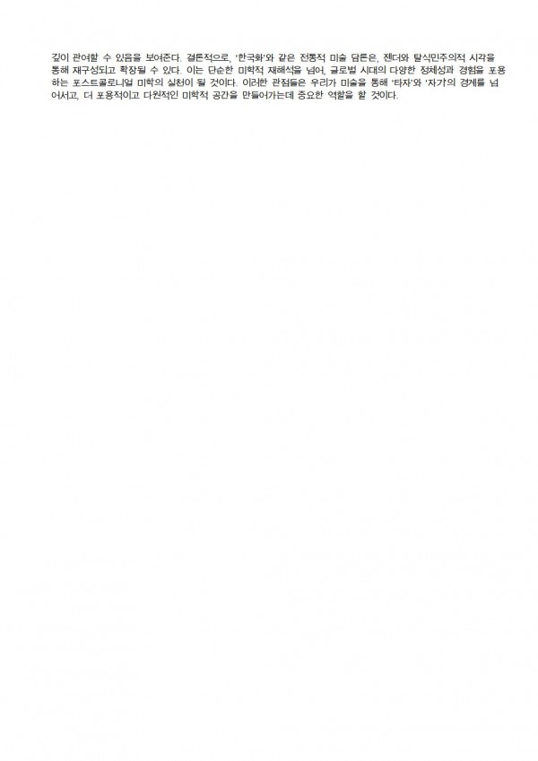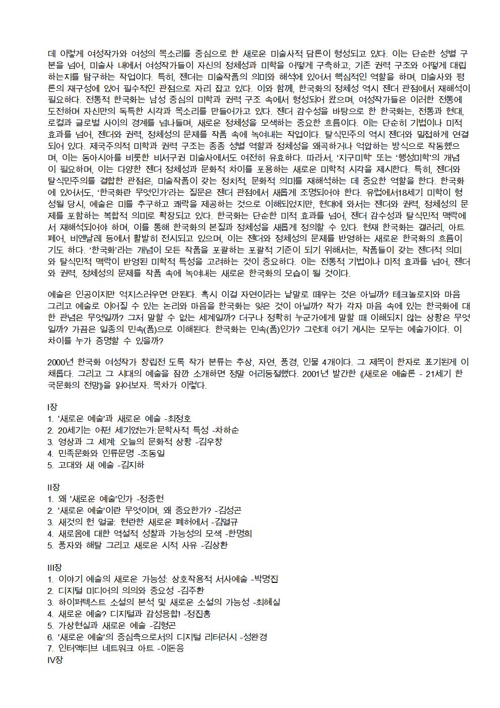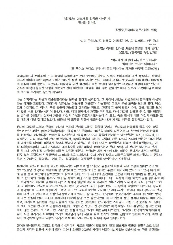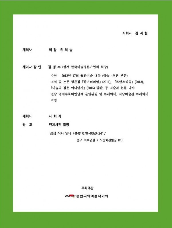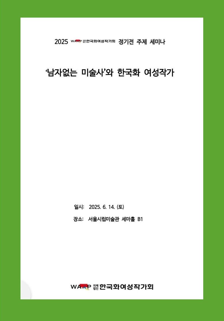 2025 제26회 정기전 주제 세미나[ '남자없는 미술사' 와 한국화 여성작가 ] 서울시립미술관 세마홀 1 페이지 정보 작성자 우먼아트 작성일25-06-16 00:41 조회324회 댓글0건 관련링크 이전글 다음글 목록 본문 댓글목록 등록된 댓글이 없습니다. 이전글 다음글 목록